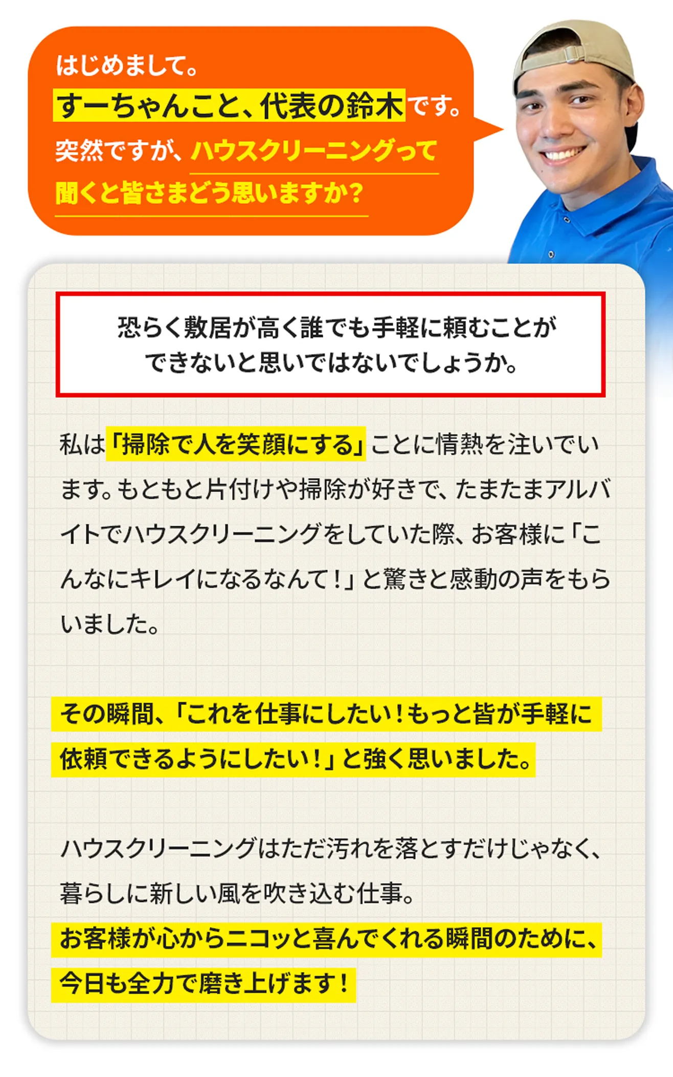 ハウスクリーニングの固定概念を私(すーちゃん)自身が変えたという熱い思いが溢れている!